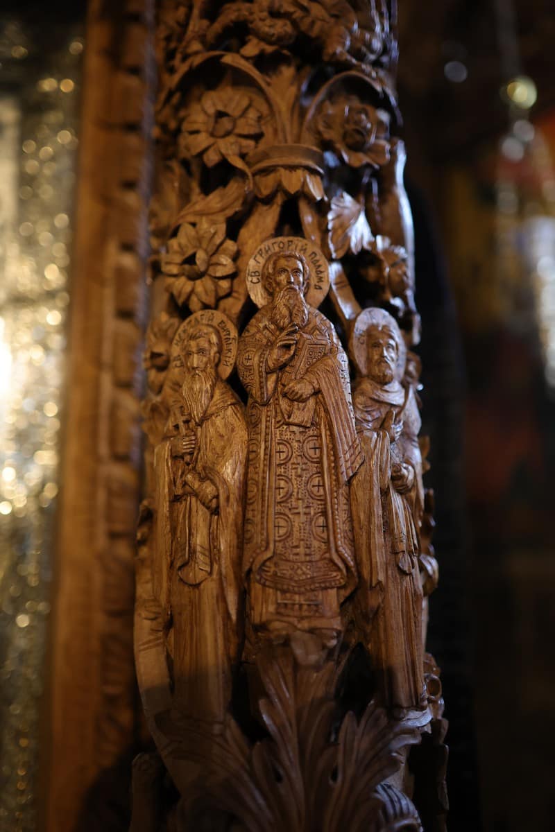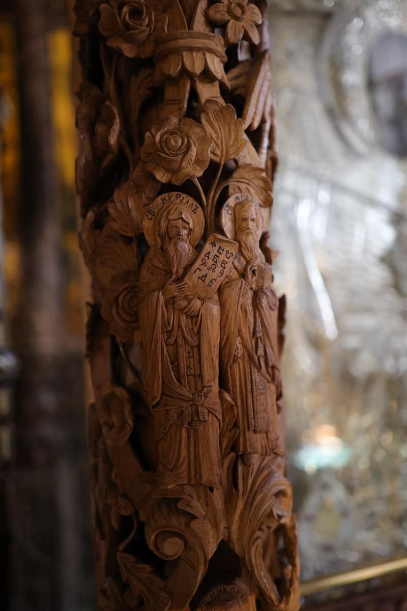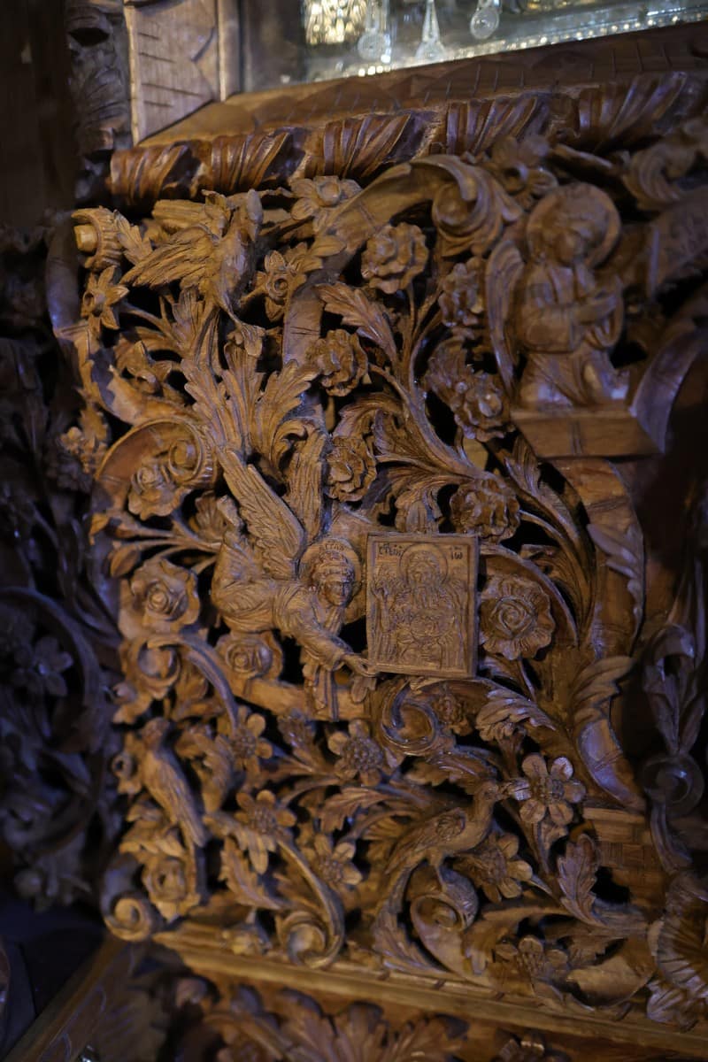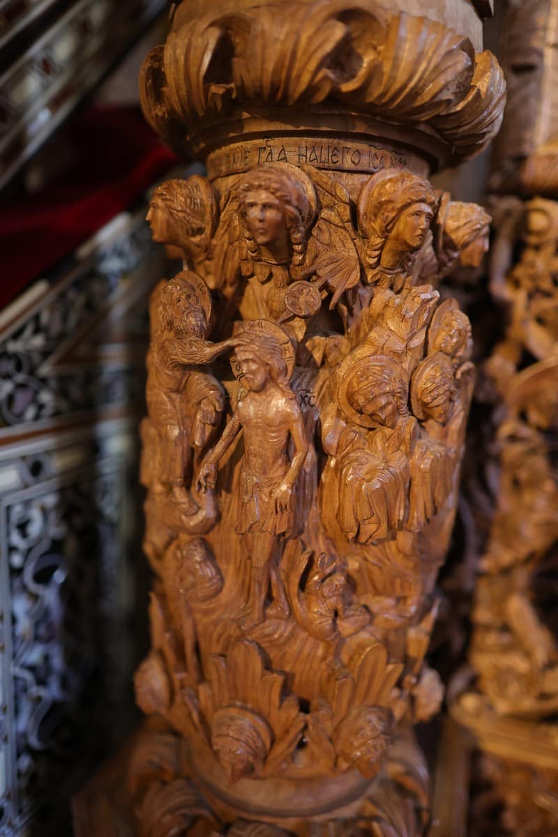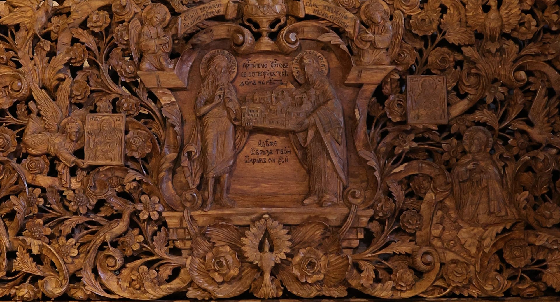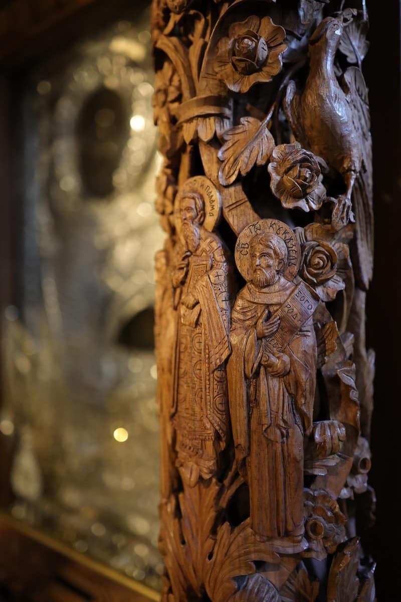Проскинитарија за иконата на Св. Јован Крстител во бигорскиот манастир Christ Enthroned Acroteria Детали на акротеријата: Дејзис, Серафим, Херувим, Престол, Св. Јован Дебранин, Игуман Арсениј Ваза.1 на столб Рождество на Св. Јован, Усекование и Чесната негова глава Богојавление Целивални