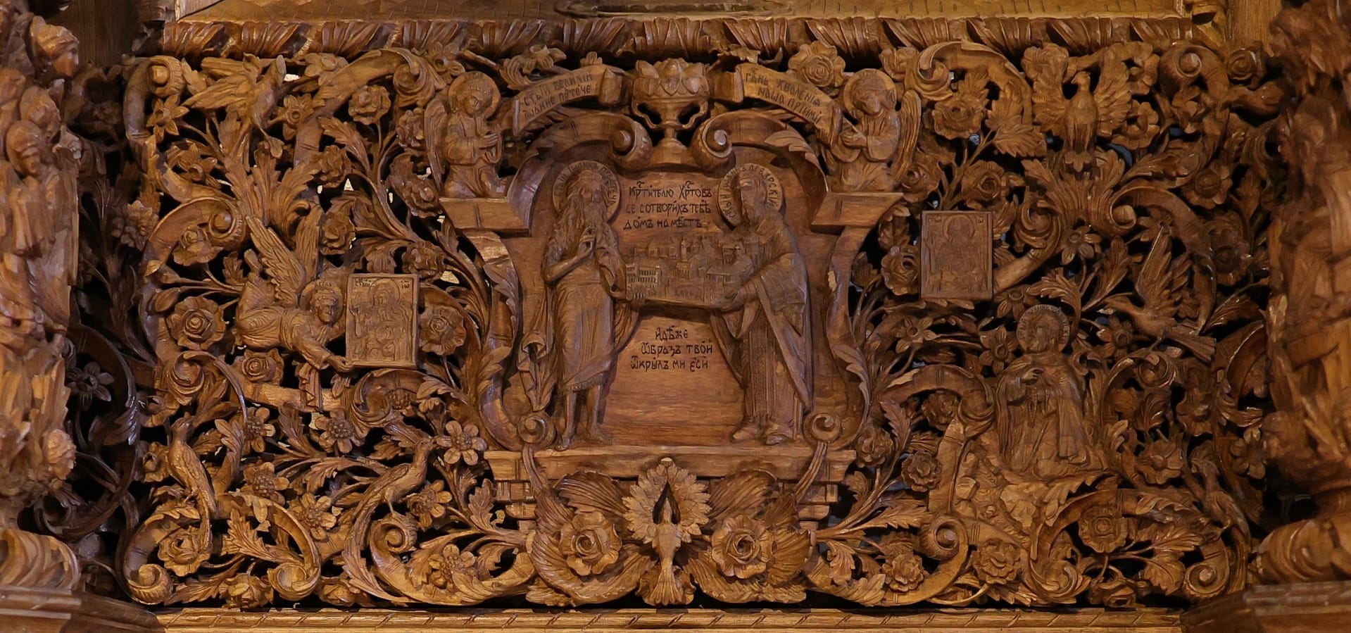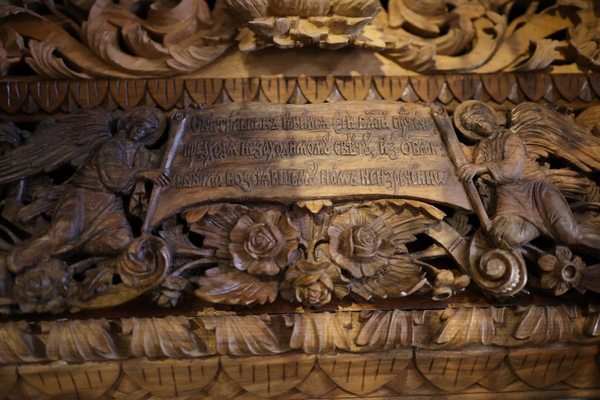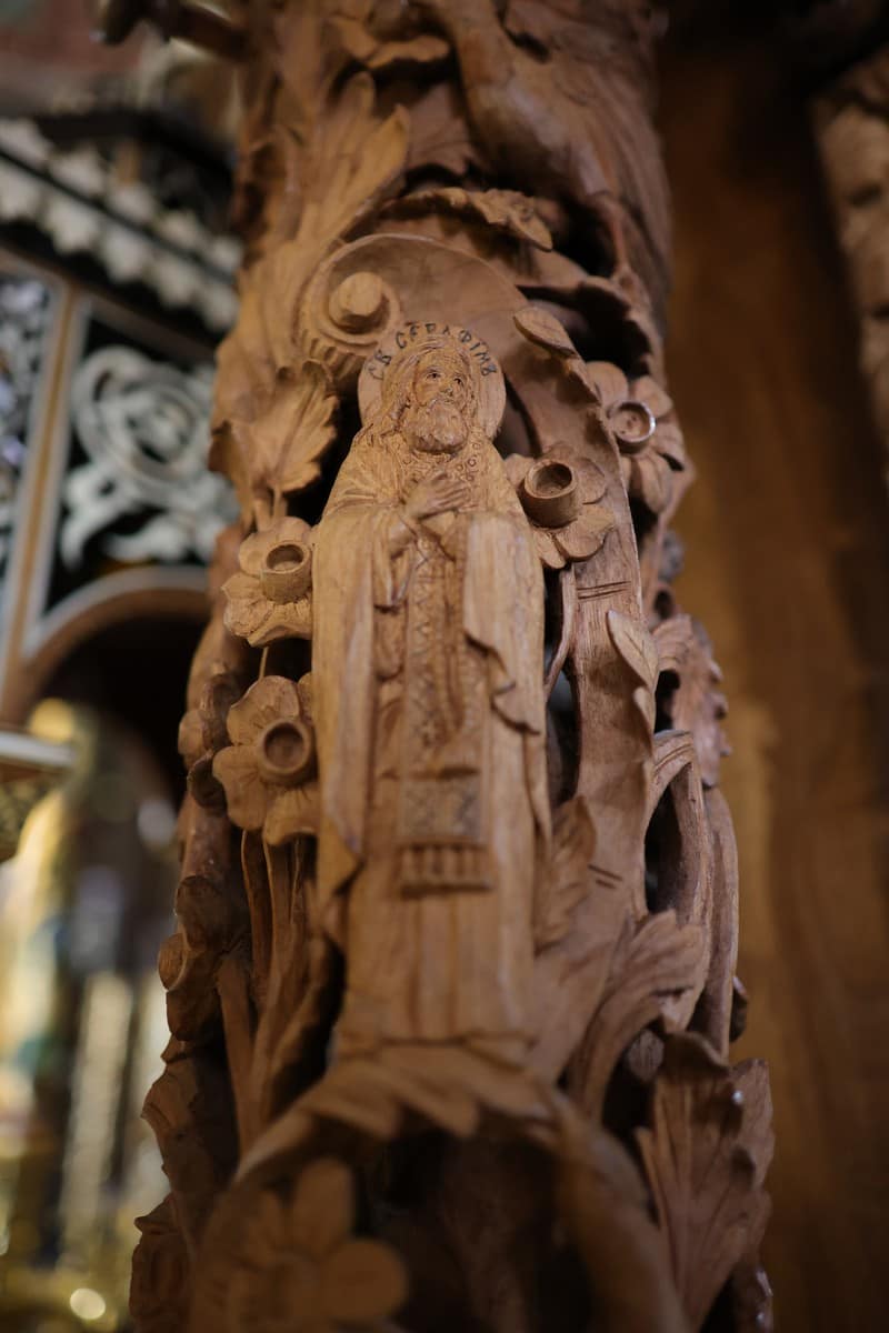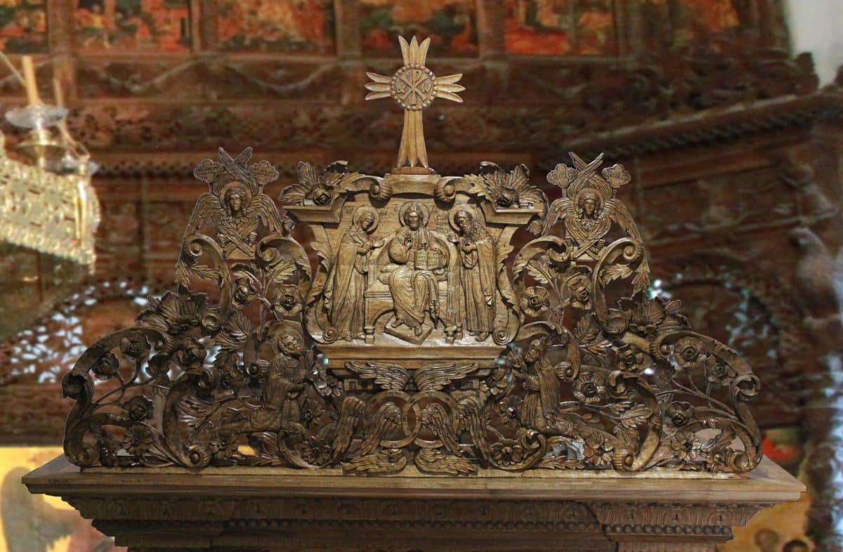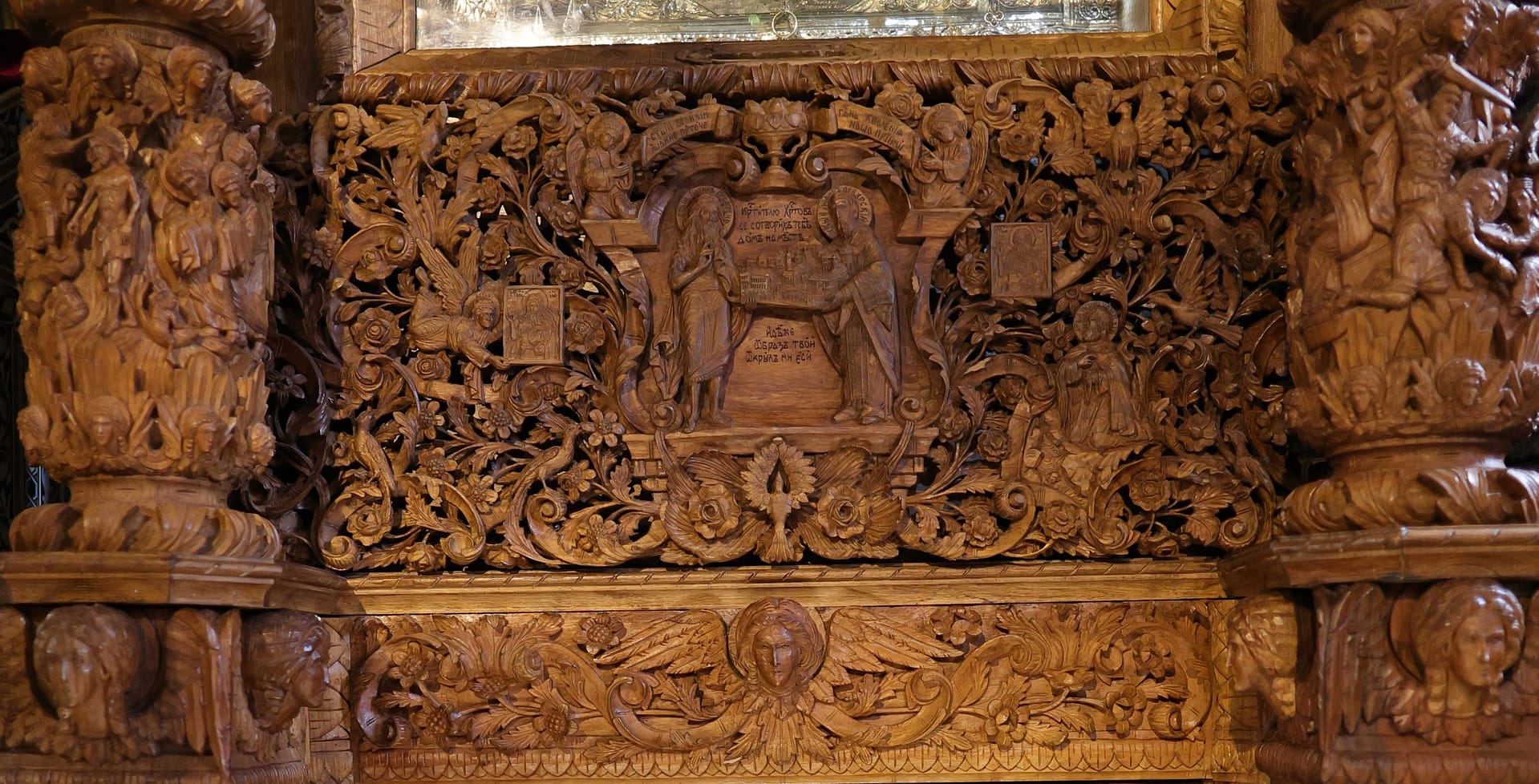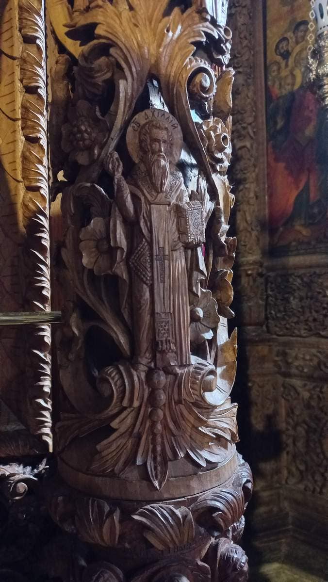 Проскинитарија за иконата на Св. Јован Крстител во бигорскиот манастир Christ Enthroned Acroteria Детали на акротеријата: Дејзис, Серафим, Херувим, Престол, Св. Јован Дебранин, Игуман Арсениј Ваза.1 на столб Рождество на Св. Јован, Усекование и Чесната негова глава Богојавление Целивални