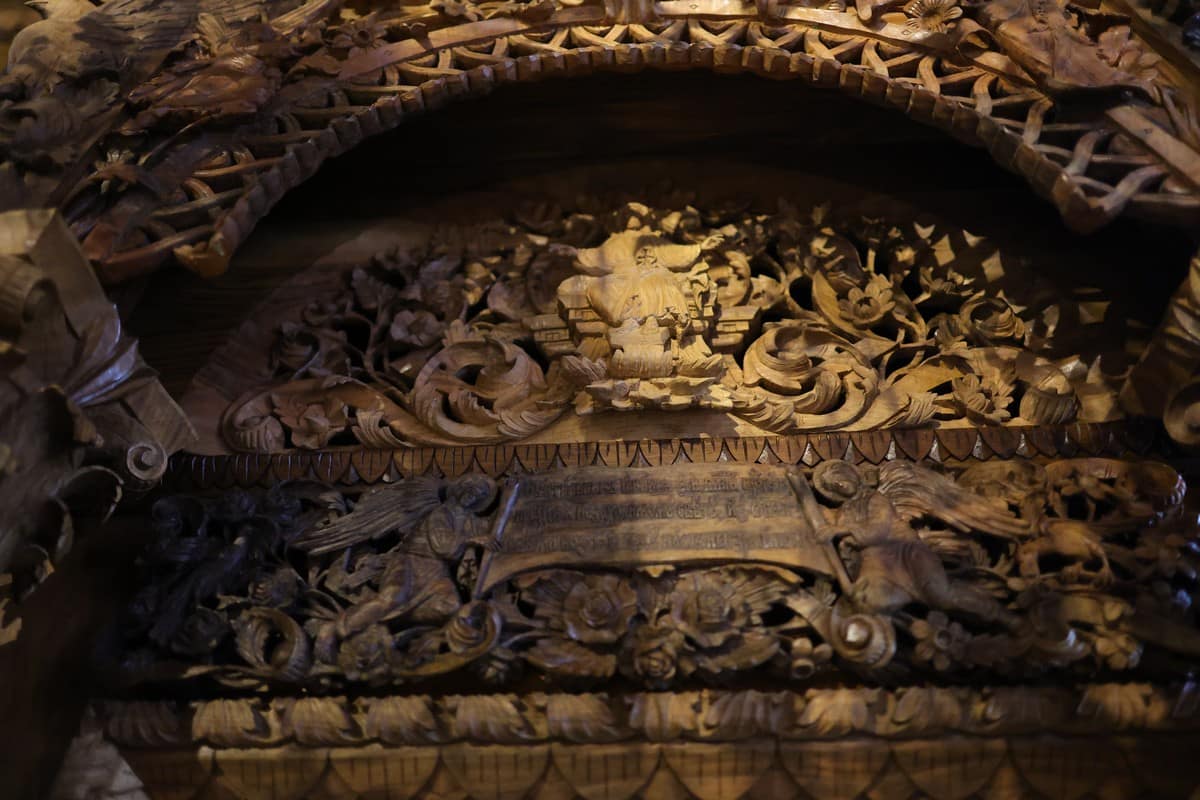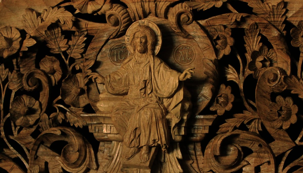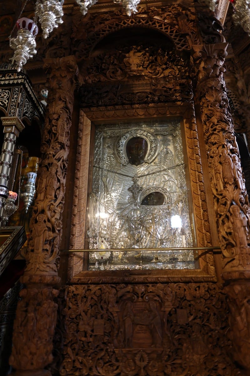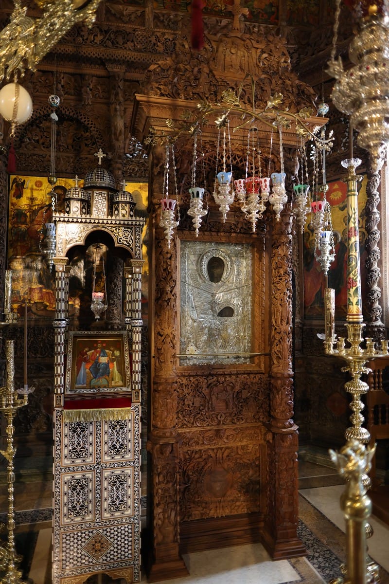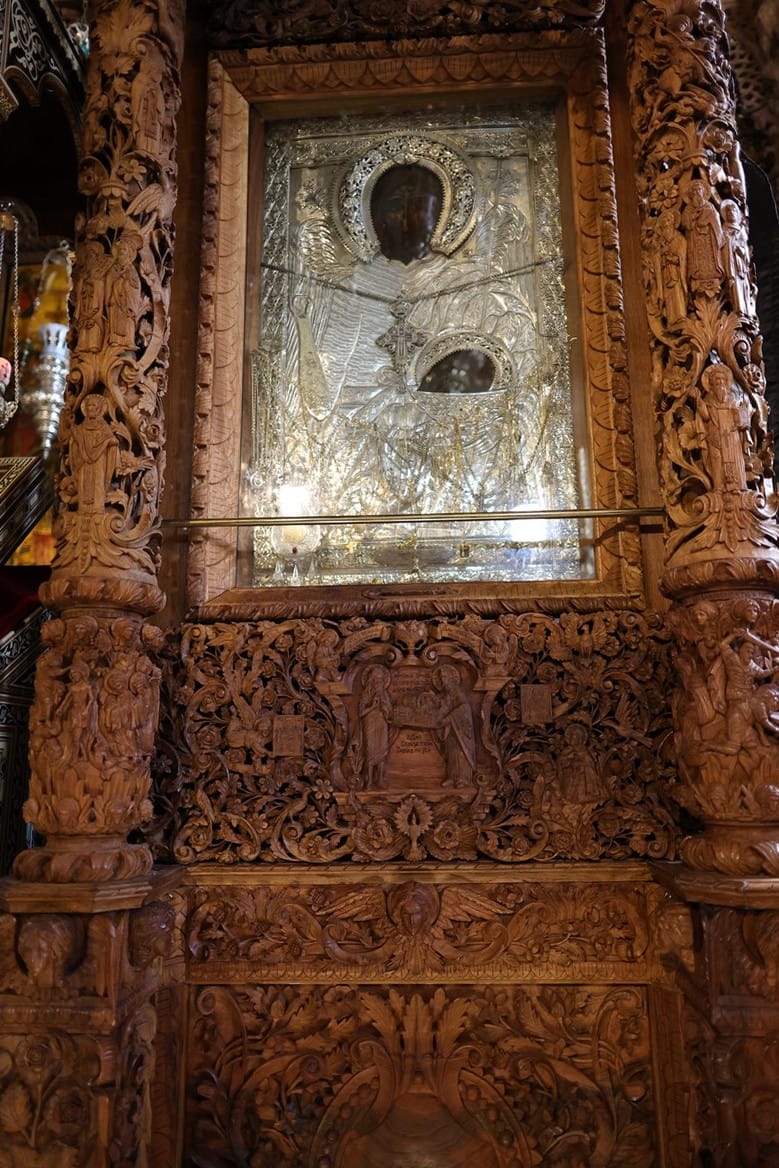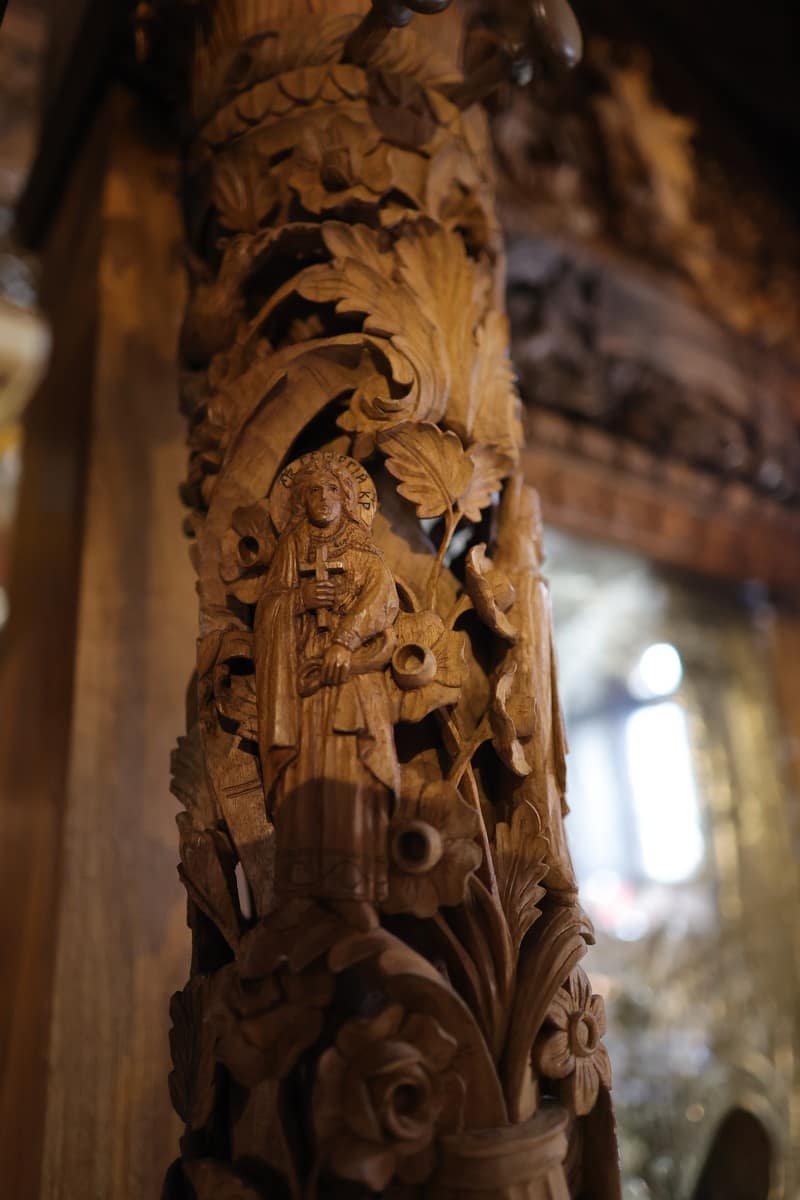 Проскинитарија за иконата на Св. Јован Крстител во бигорскиот манастир Christ Enthroned Acroteria Детали на акротеријата: Дејзис, Серафим, Херувим, Престол, Св. Јован Дебранин, Игуман Арсениј Ваза.1 на столб Рождество на Св. Јован, Усекование и Чесната негова глава Богојавление Целивални