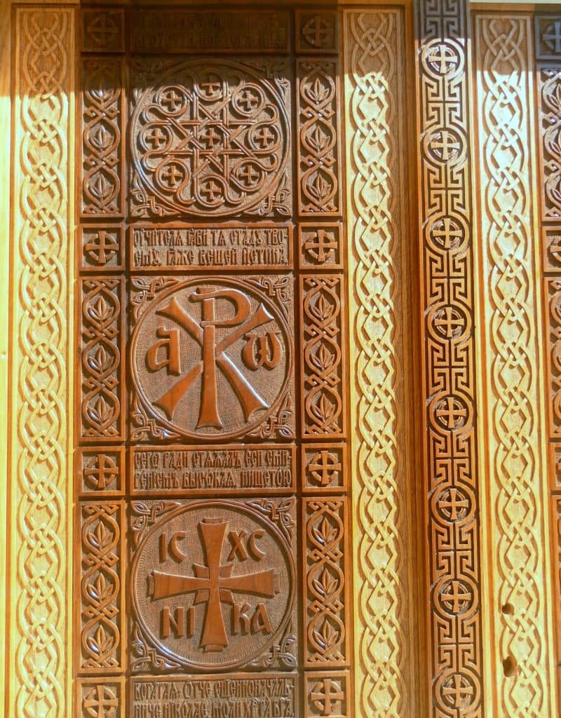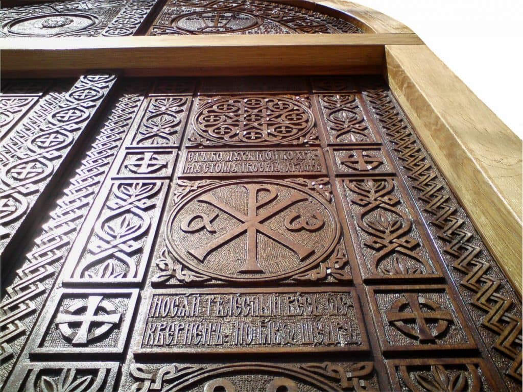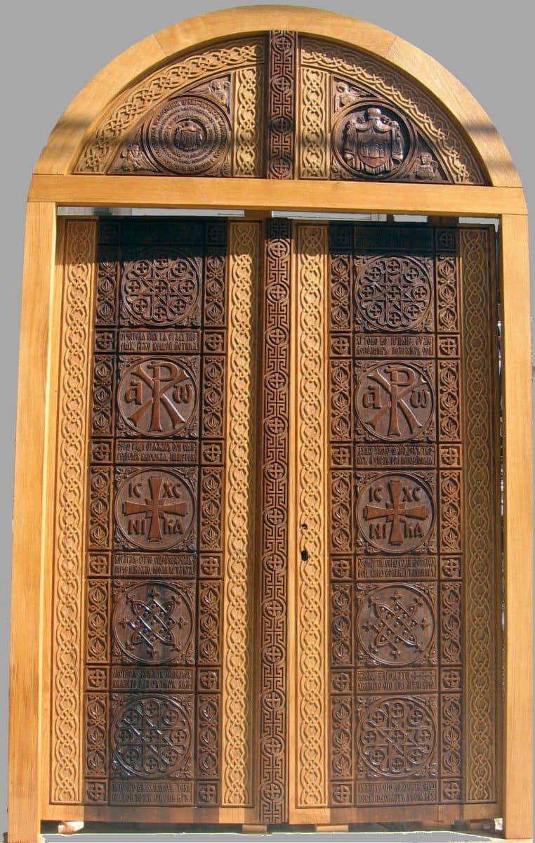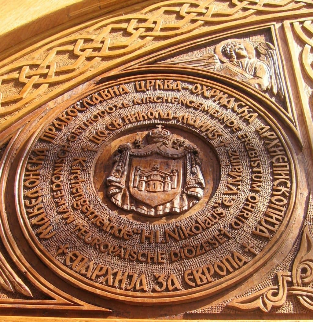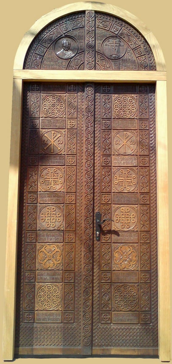 Западната и јужната порта во храмот посветен на Свети Никола Архиепископ Мирликиски, чудотворец во Мајнц, Р. Германија. Направени се во комбинација од орево и дабово дрво.