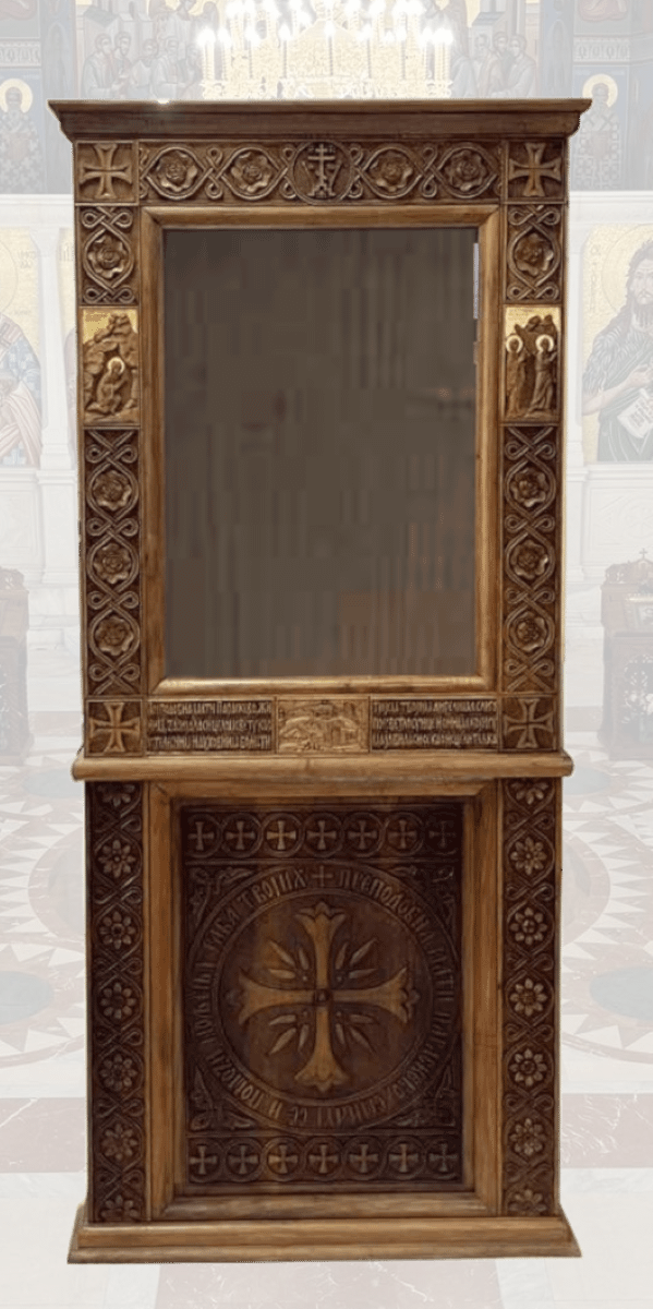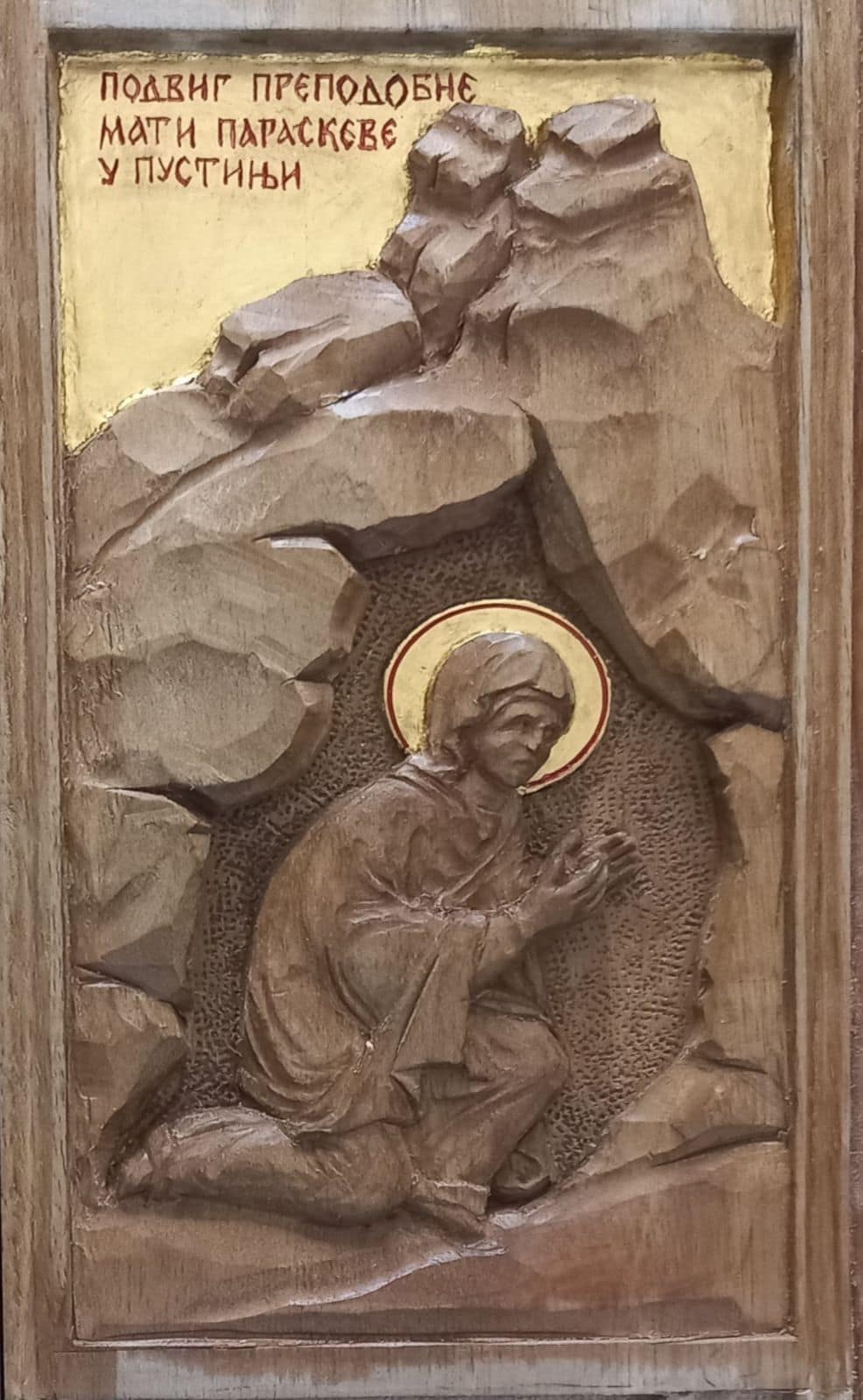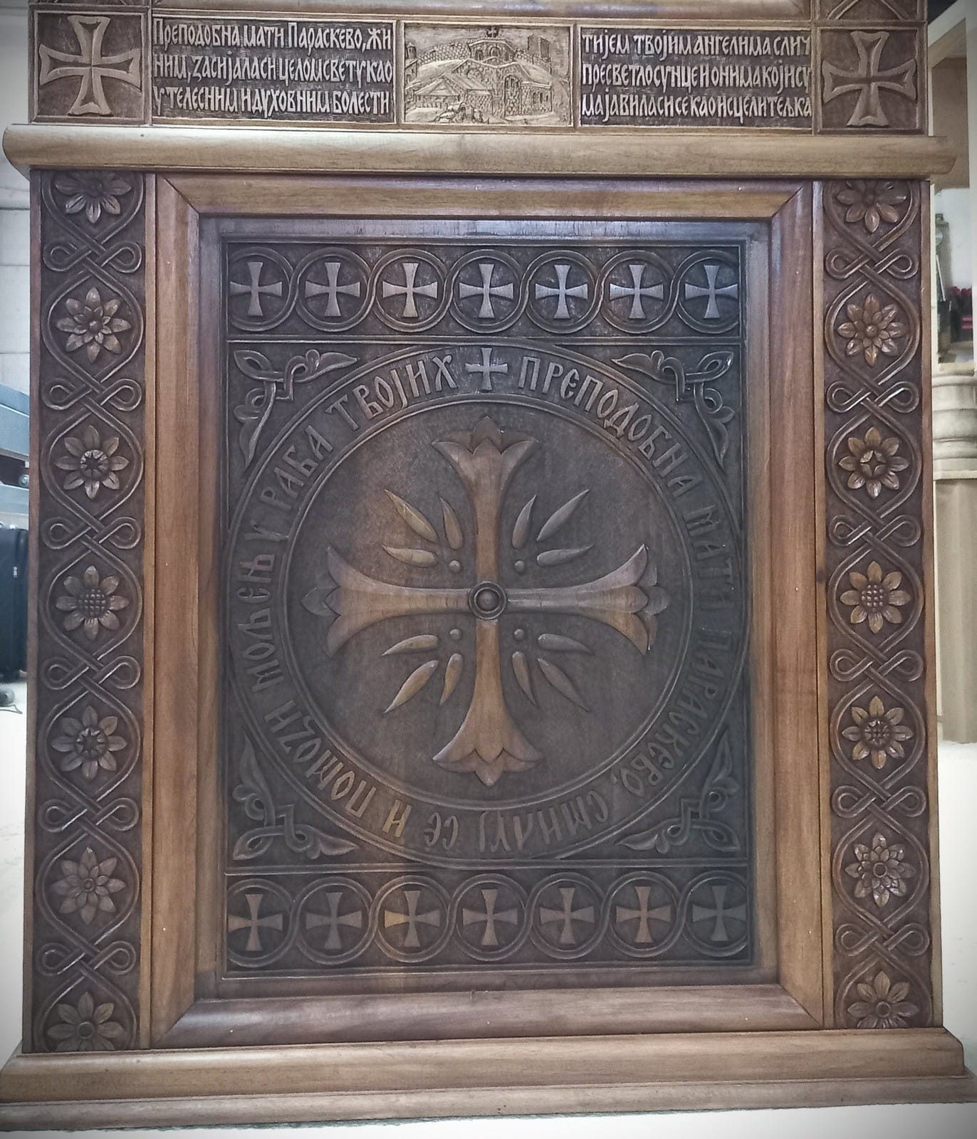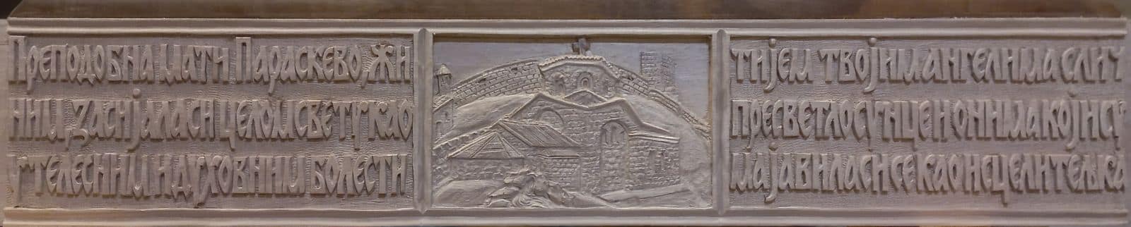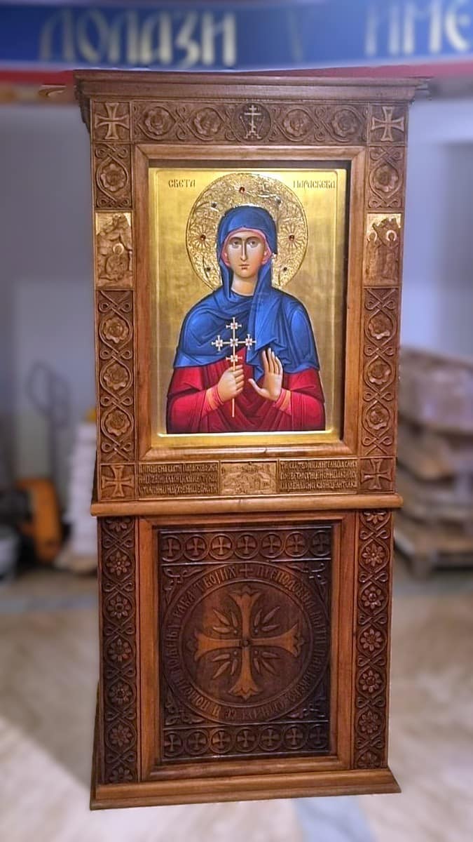Throne for the icon of St. Paraskevi Трон (Проскинитарија) за икона на Св. Петка Икониска Подвиг на Преподобна Петка во пустина Позив да се врати во родниот крај Детаљ: Храмот на Св.Петка на Калемегдан
